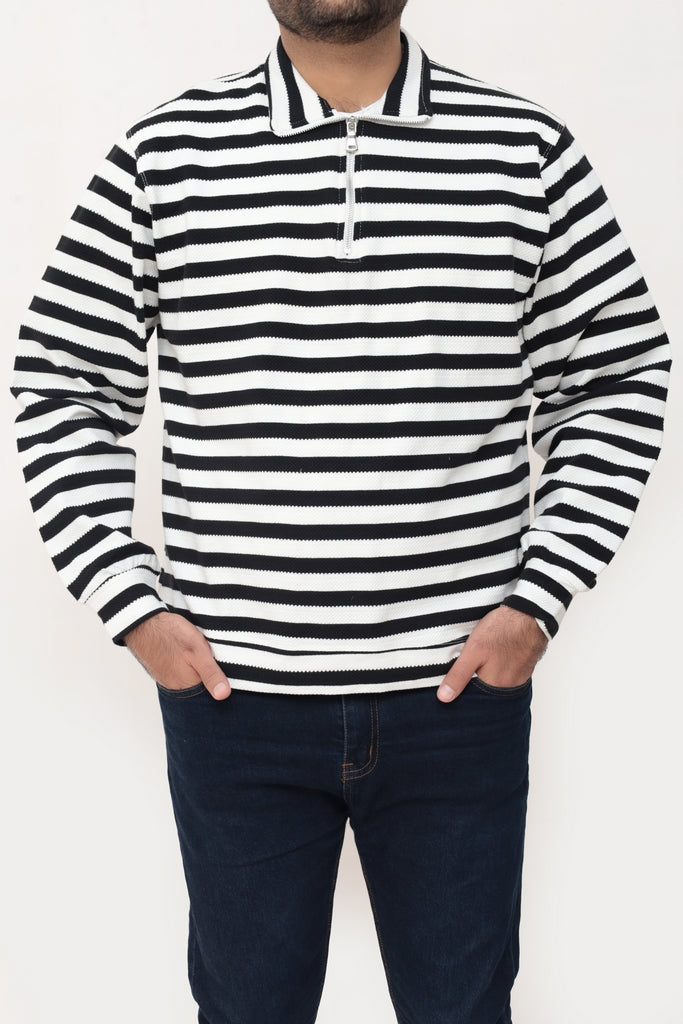 Old Money Men's Zipped Black Striped Textured Sweat Shirt