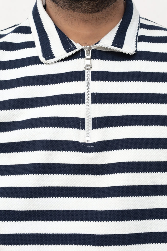 Old Money Men's Zipped Navy Striped Textured Sweat Shirt